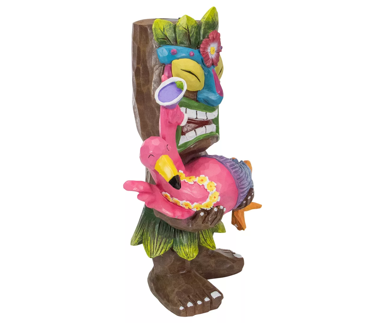 Add tropical flair to your outdoor living space decorating with this solar statuary! A Tiki statue holds a fun-loving flamingo dressed in flowers and a grass skirt. Illuminating at night from solar-powered lighting, this statue is perfect for display in a garden, yard or patio.