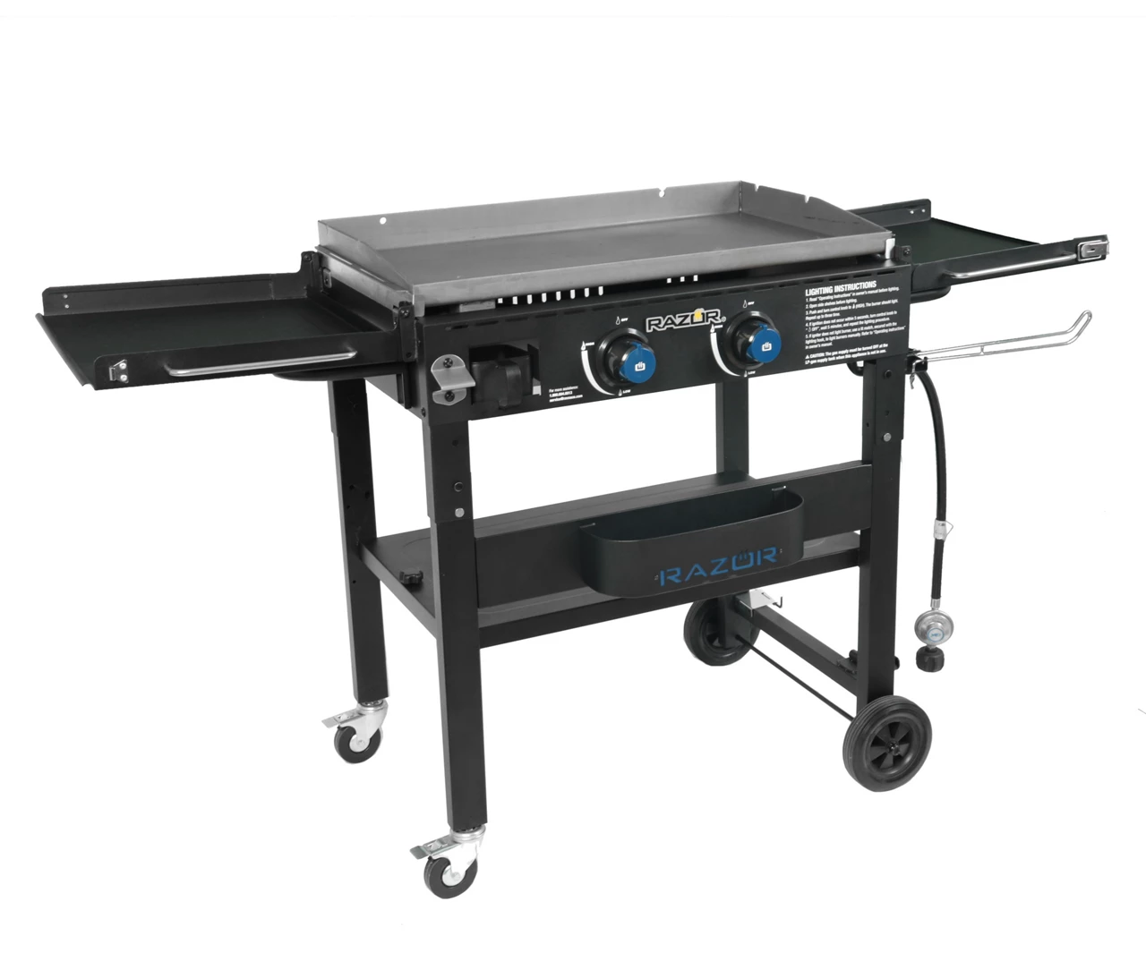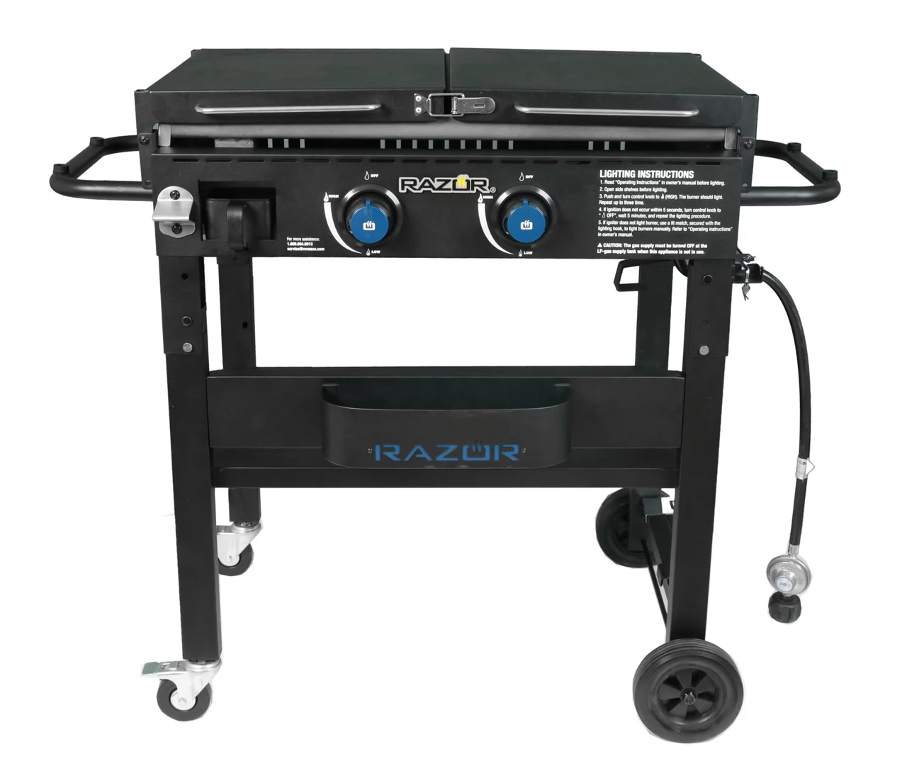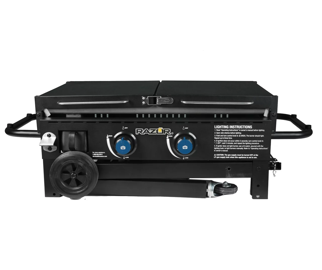 Cook up to 37 burgers at a time, fry up some eggs, sizzle some bacon or even do stir fry all with the versatile Razor super-sized griddle grill. Perfect for camping, tailgating or your backyard, the griddle features two stainless steel burners for a total of 30,000 BTUs of power. A push and turn ignition makes this griddle easy to light and simple to use. Clean up is a snap and no spills with the unique grease management system and concealed cup. Ultra handy shelves fold and double as a fitted lid that locks, protecting the cooking surface. The wheels and compact design make transporting easy for your next event.