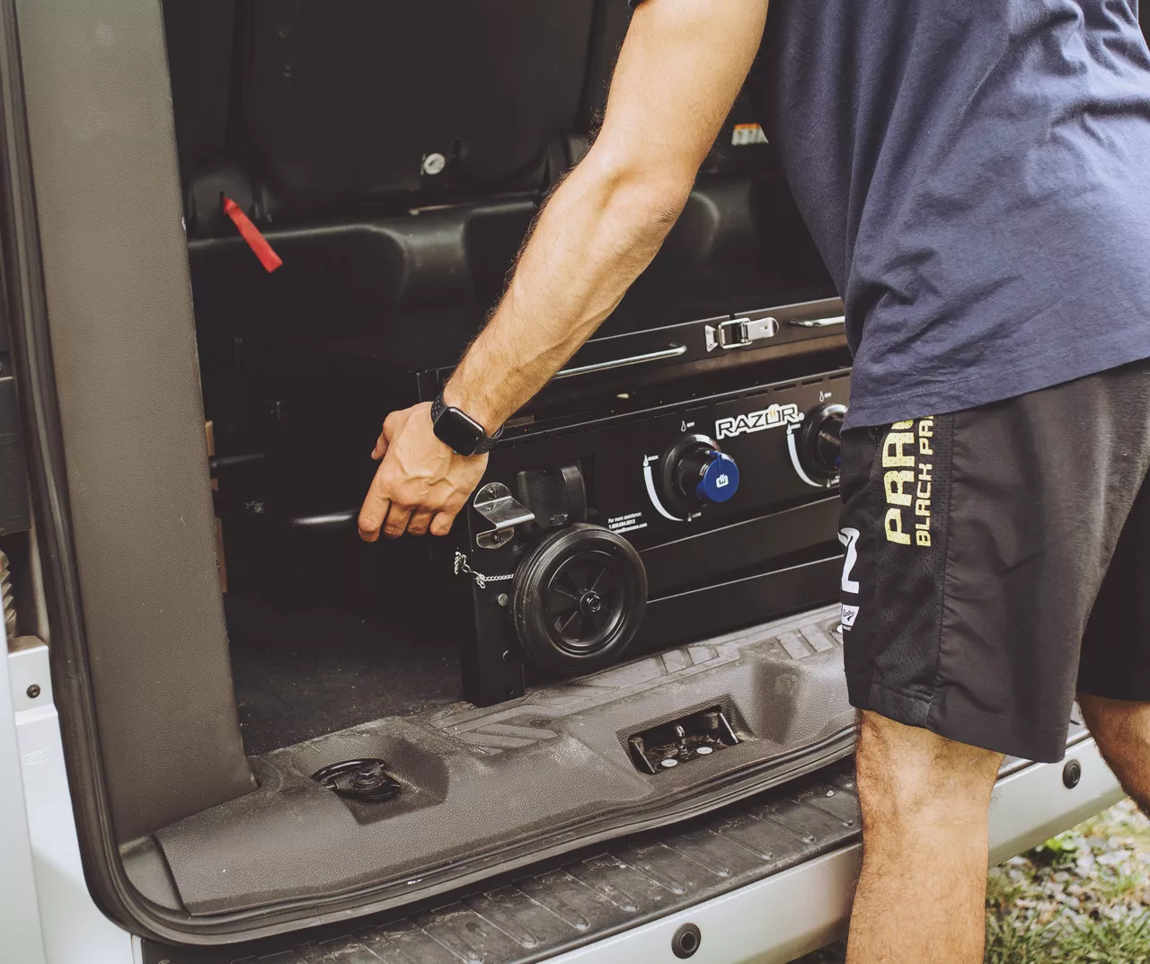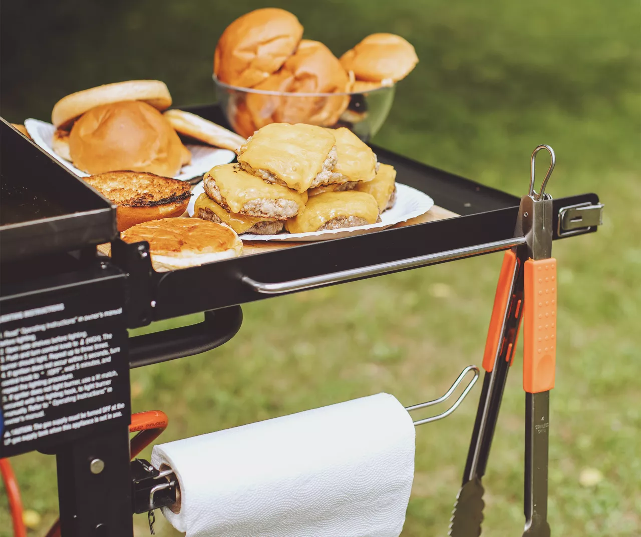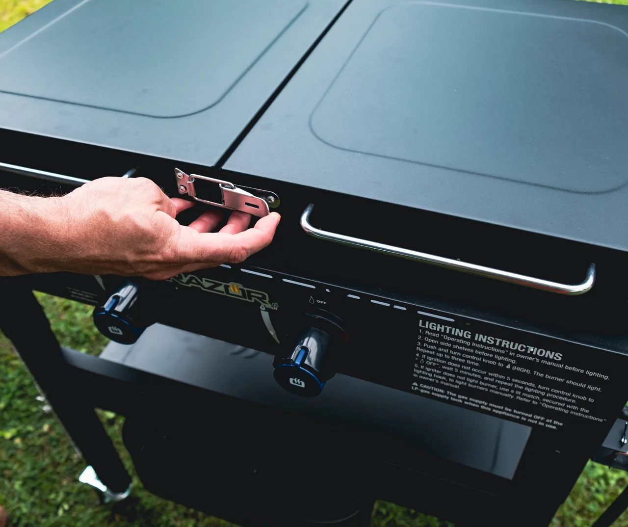 Cook up to 37 burgers at a time, fry up some eggs, sizzle some bacon or even do stir fry all with the versatile Razor super-sized griddle grill. Perfect for camping, tailgating or your backyard, the griddle features two stainless steel burners for a total of 30,000 BTUs of power. A push and turn ignition makes this griddle easy to light and simple to use. Clean up is a snap and no spills with the unique grease management system and concealed cup. Ultra handy shelves fold and double as a fitted lid that locks, protecting the cooking surface. The wheels and compact design make transporting easy for your next event.
