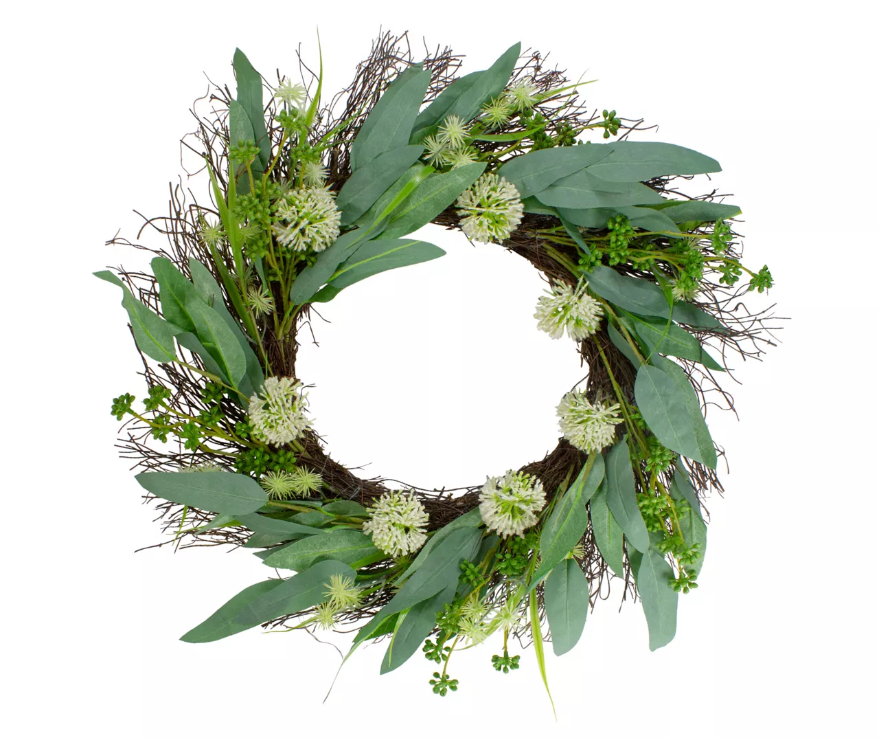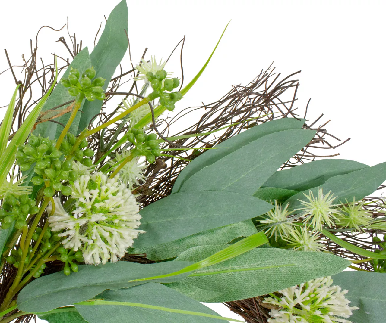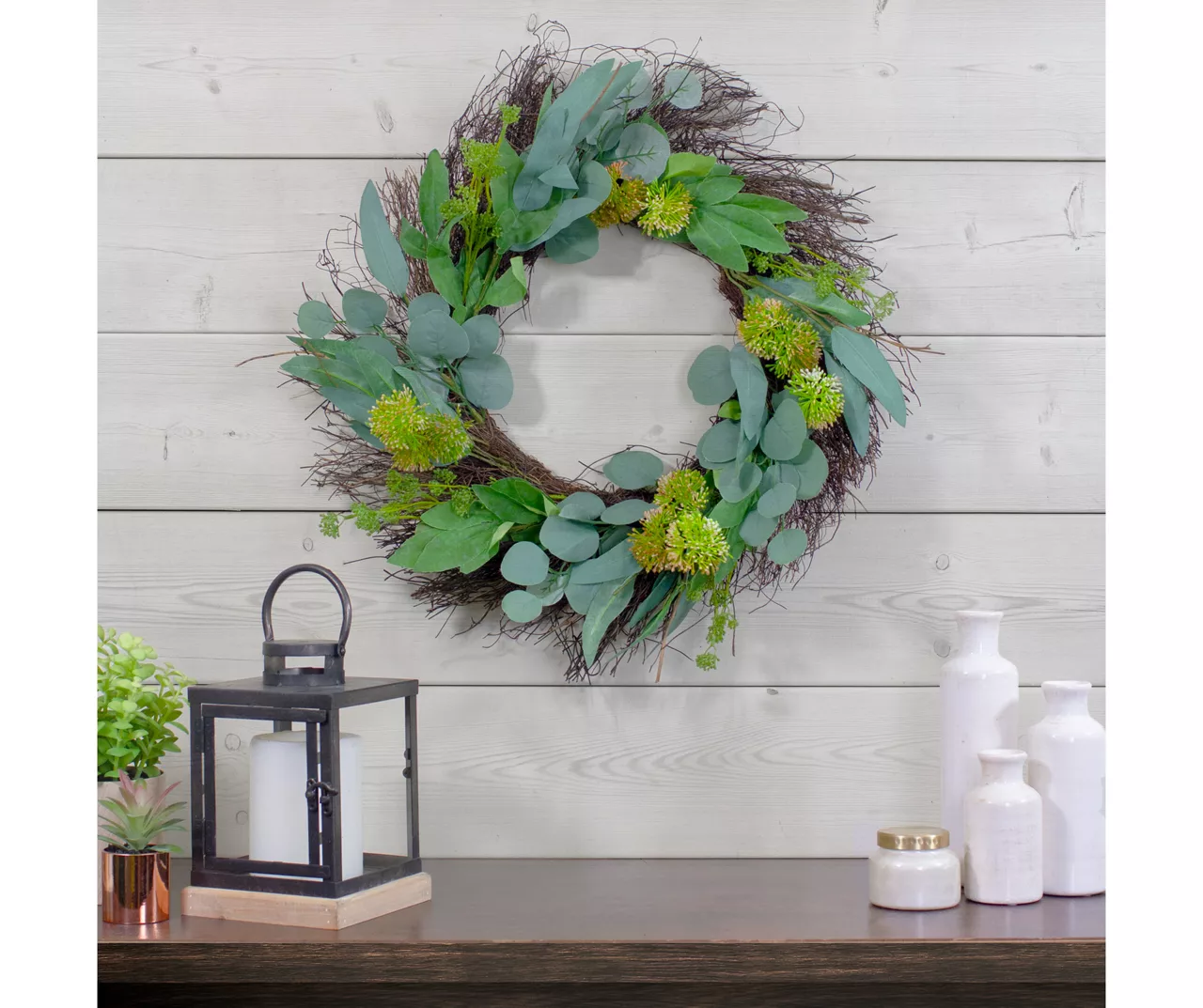 Add a touch of nature to your home with this wreath. Realistic olive leaves are paired with various flowers and bud accents to create a beautiful seasonal arrangement. It’s perfect for showcasing springtime in a living space, entryway or kitchen.