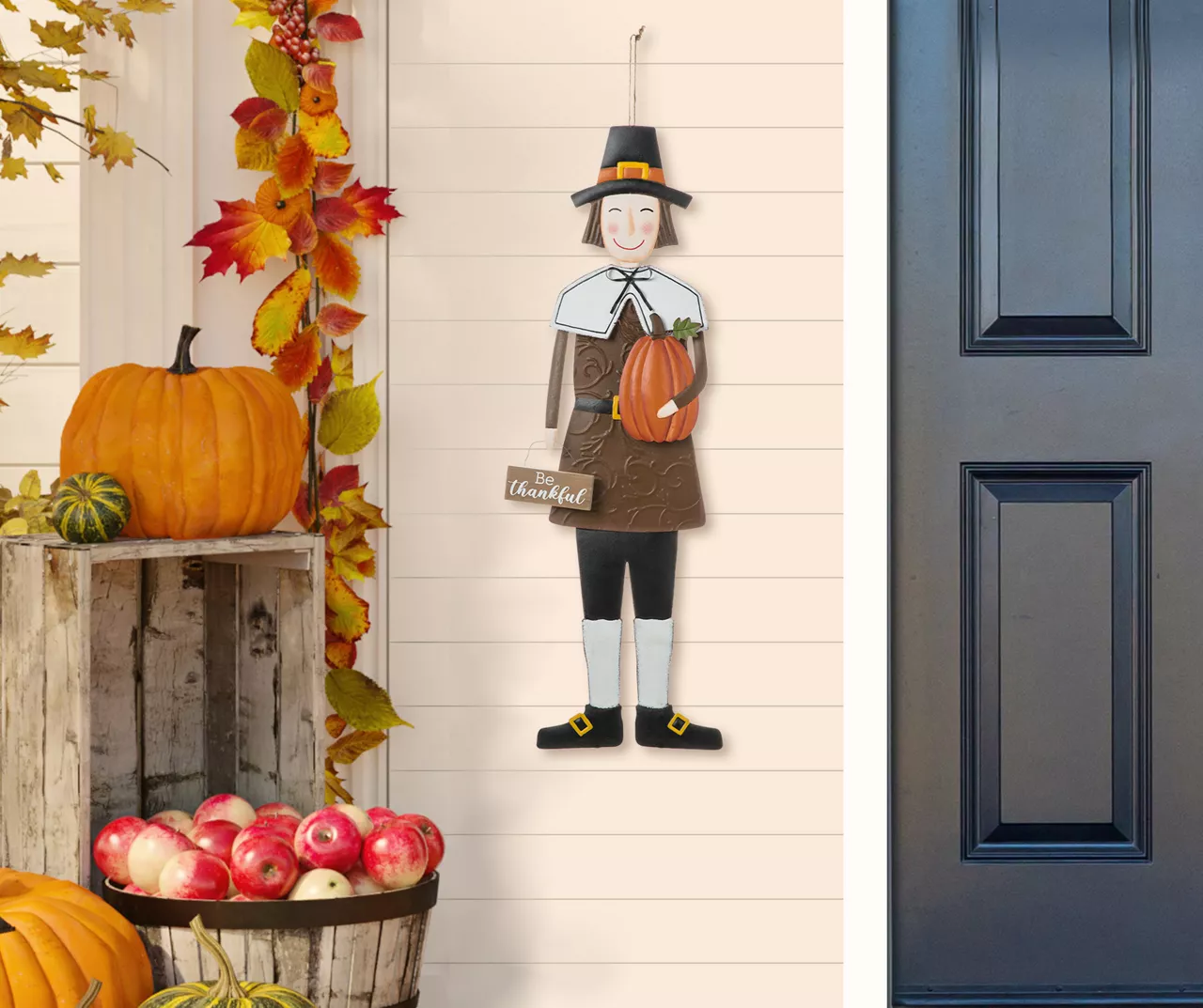The handsome yard stake will brighten your garden in Thanksgiving Day charm! This yard stake is made from metal and features with the cute pilgrim boy, embellished with a classical pumpkin, textured clothes and a “Be thankful” sign in his hand. It also offers a delightful way to greet guests on the front porch, or to add a splash of color and character to your backyard.