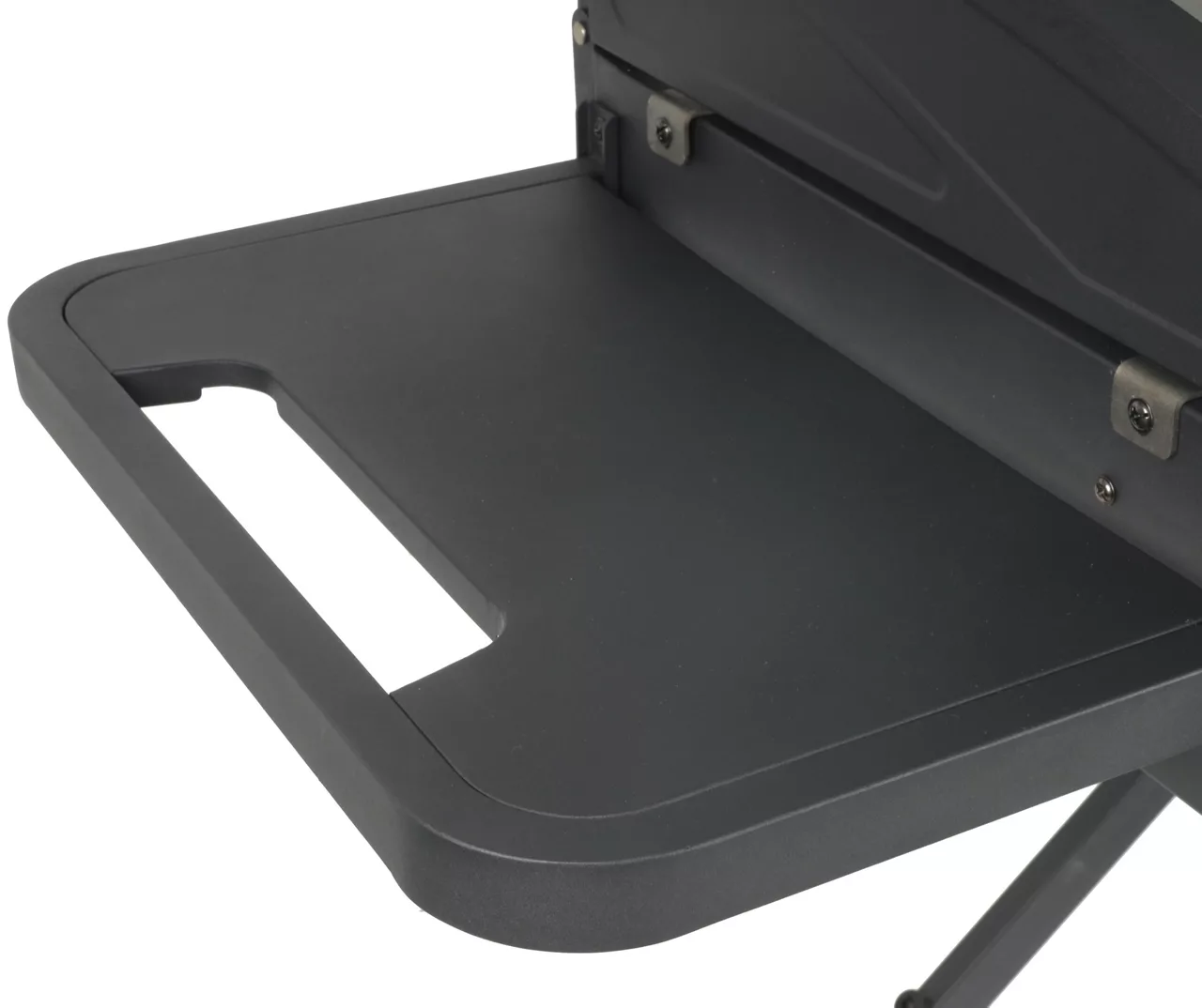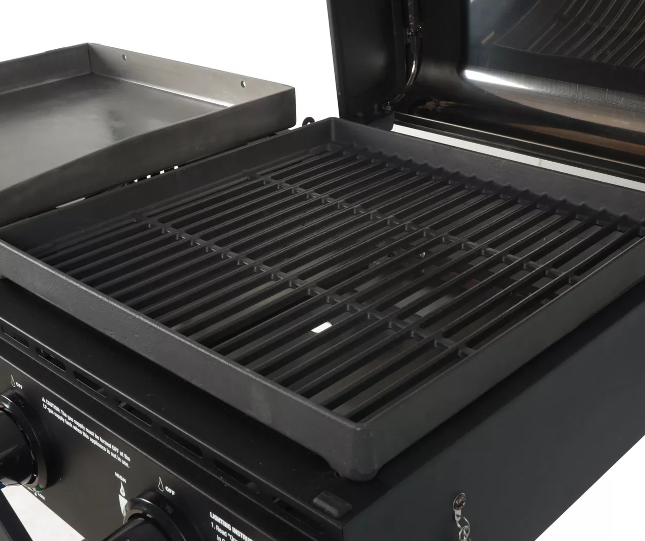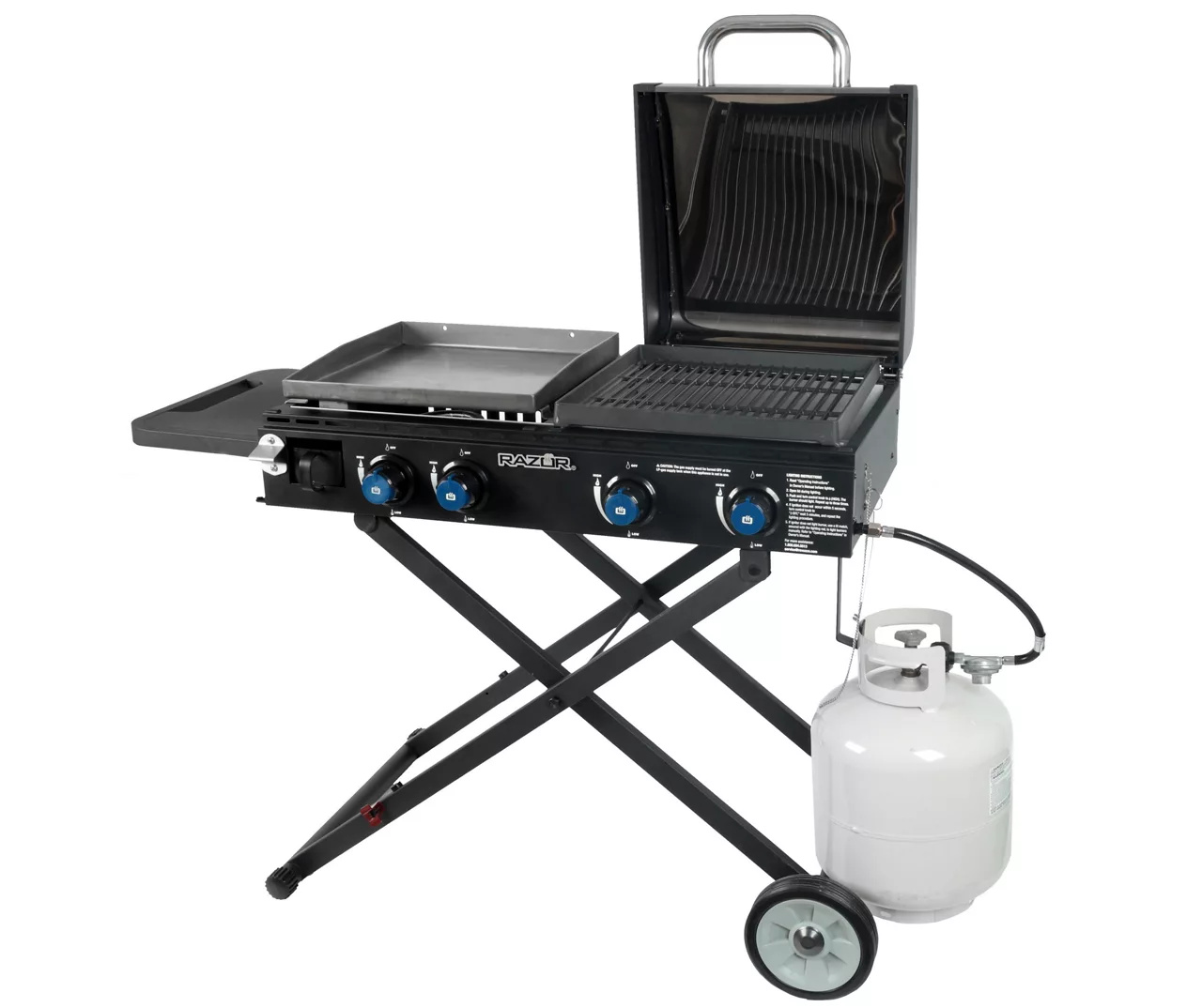 The Razor four-burner folding gas grill and griddle combo delivers two-in-one experience. With 512 square inches of cooking area, the powerful burners bring a total 44,000 BTUs of heat output to your barbecue favorites. The side shelf offers extra space for food preparation as a secure front access drain and cup provides easy grease disposal. Versatile surface for cooking breakfast, lunch and dinner. The unique mobile cart design makes it easy to fold for storage or transportation. One steel lid on the grill protects and shelters your savory meal from unexpected, incoming weather while steaming foods or melting cheeses.