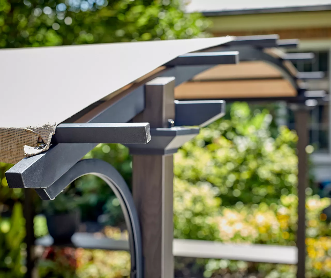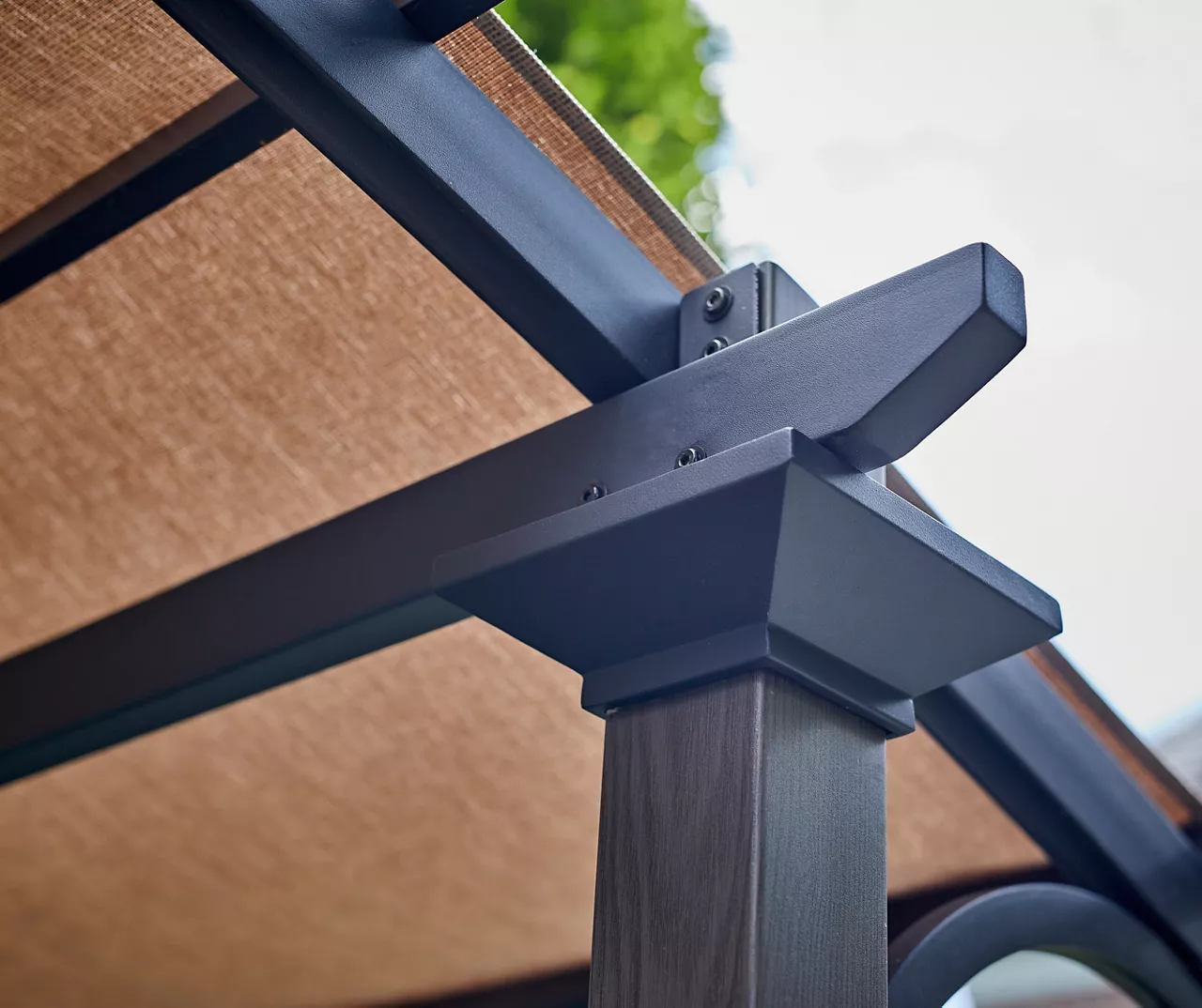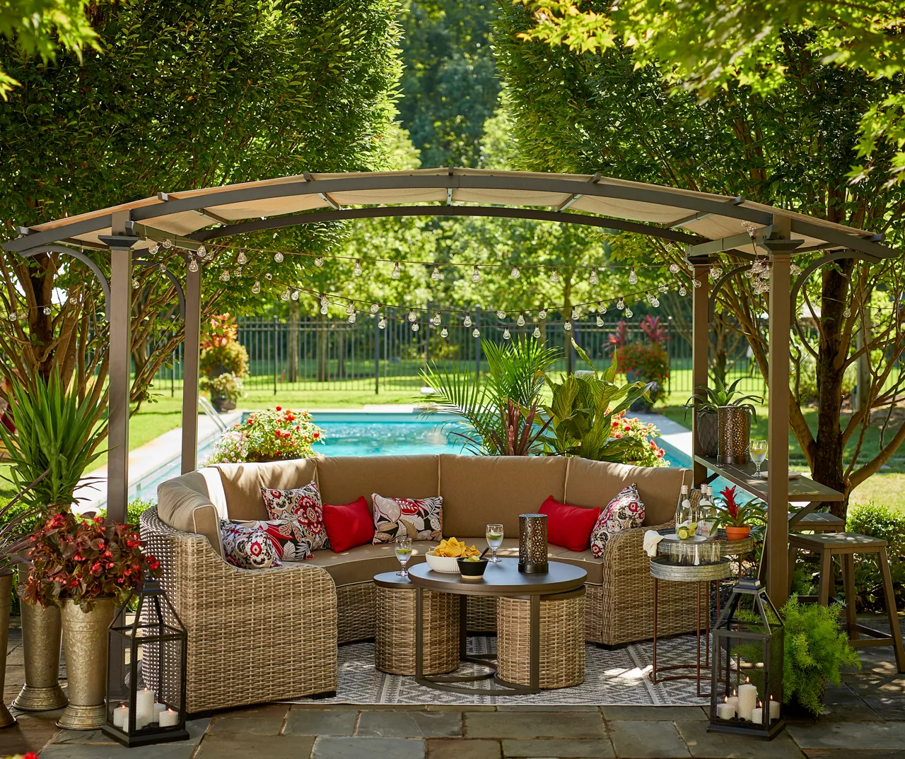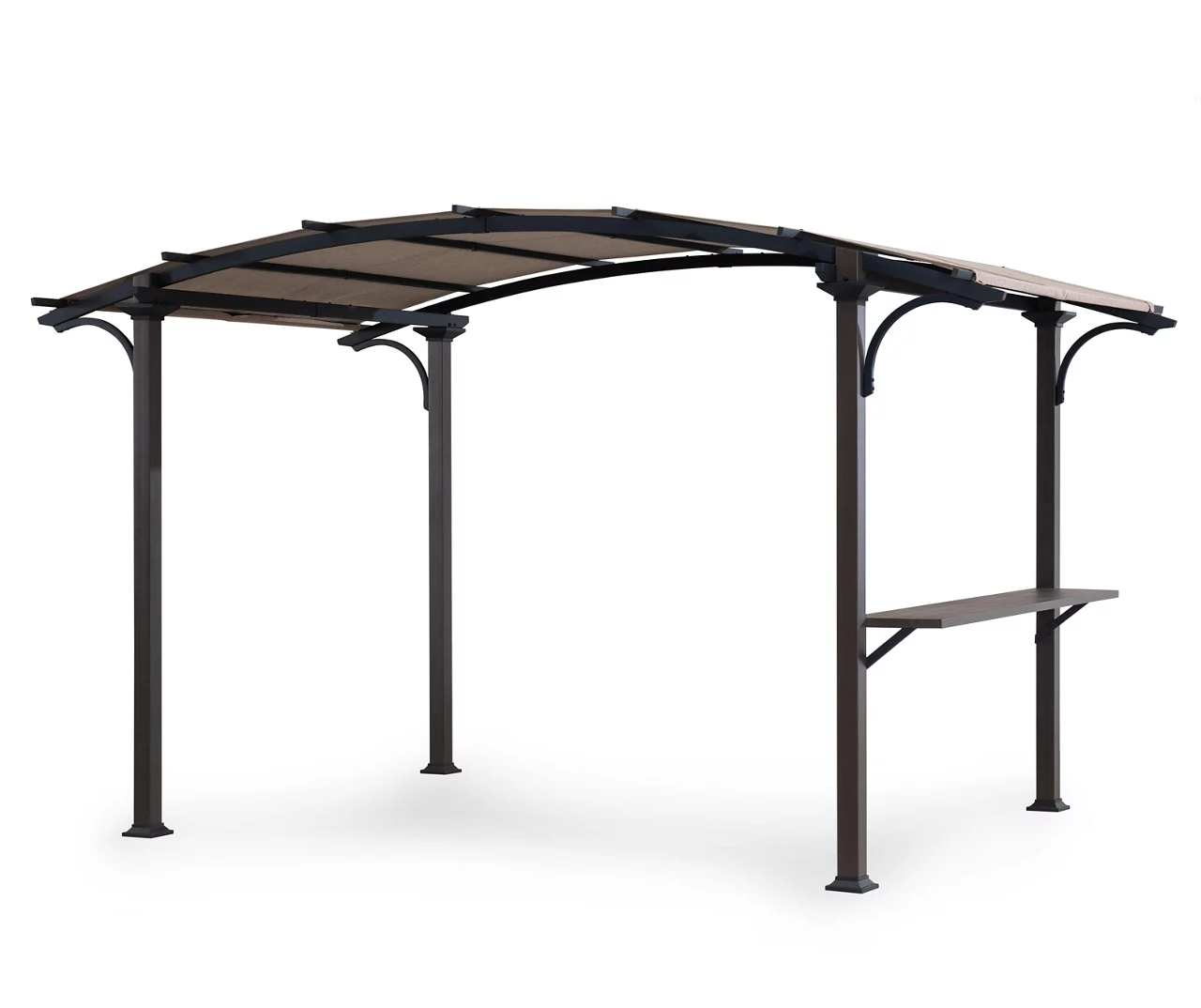Relax in the sunshine or spend summer nights underneath the Broyhill Capilano Pergola. The light-filtering sling canopy provides shade and comfort while allowing breezy airflow as its timeless style, curved details make it look like a custom-built structure. Entertaining-ready with a built-in bar with a simulated wood surface, this elevated Pergola in a substantial size accommodates a variety of dining and seating arrangements in your outdoor living space.