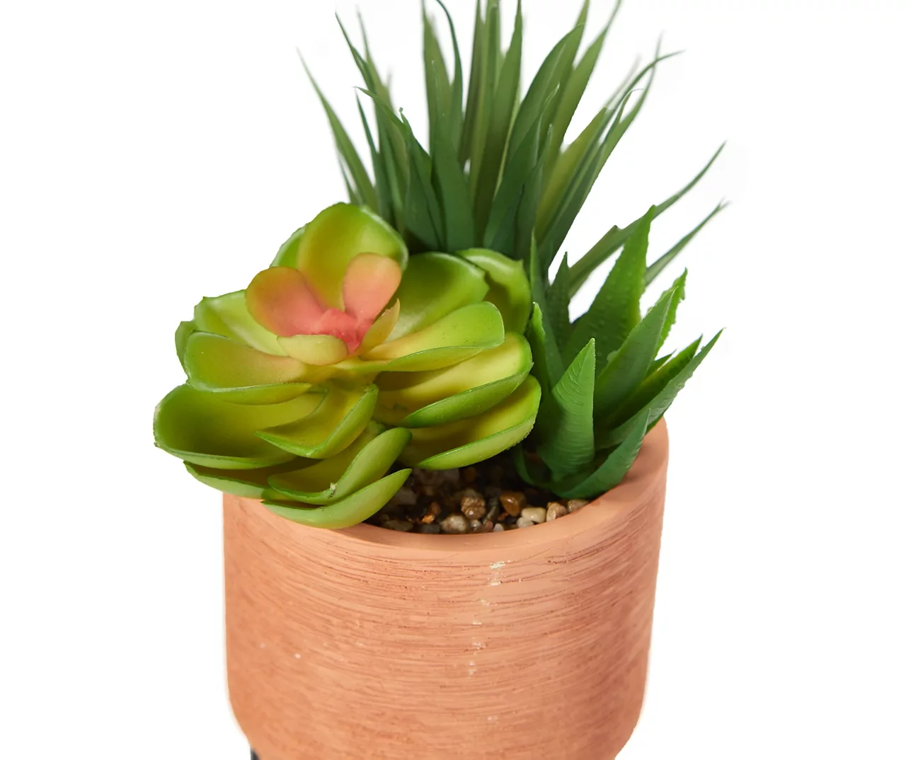 Accent your home in Southwestern charm displaying this artificial plant! A collection of realistic succulents is featured within a terra-cotta color planter showcased on a raised metal stand. This maintenance-free plant is perfect for a mantel, table or shelf.