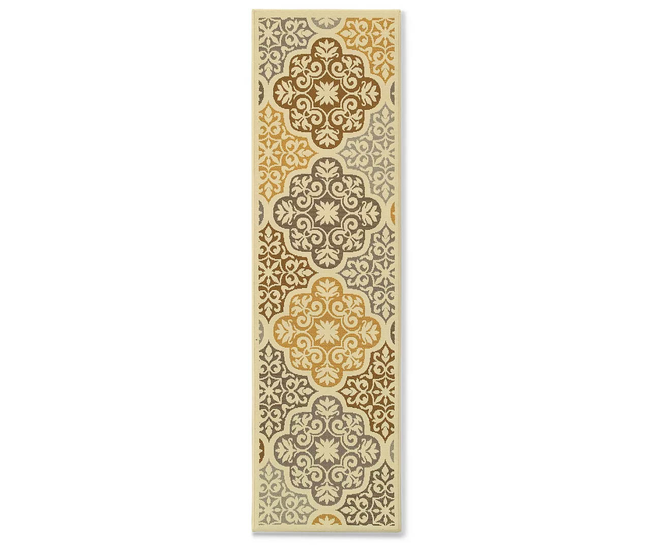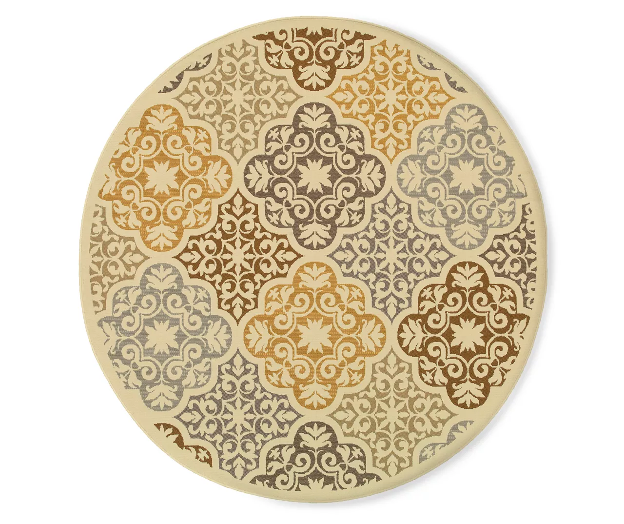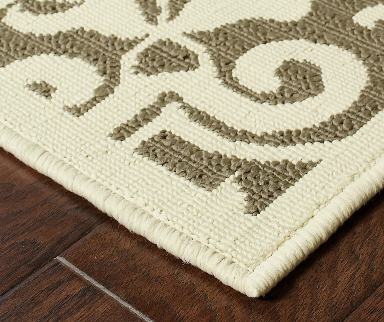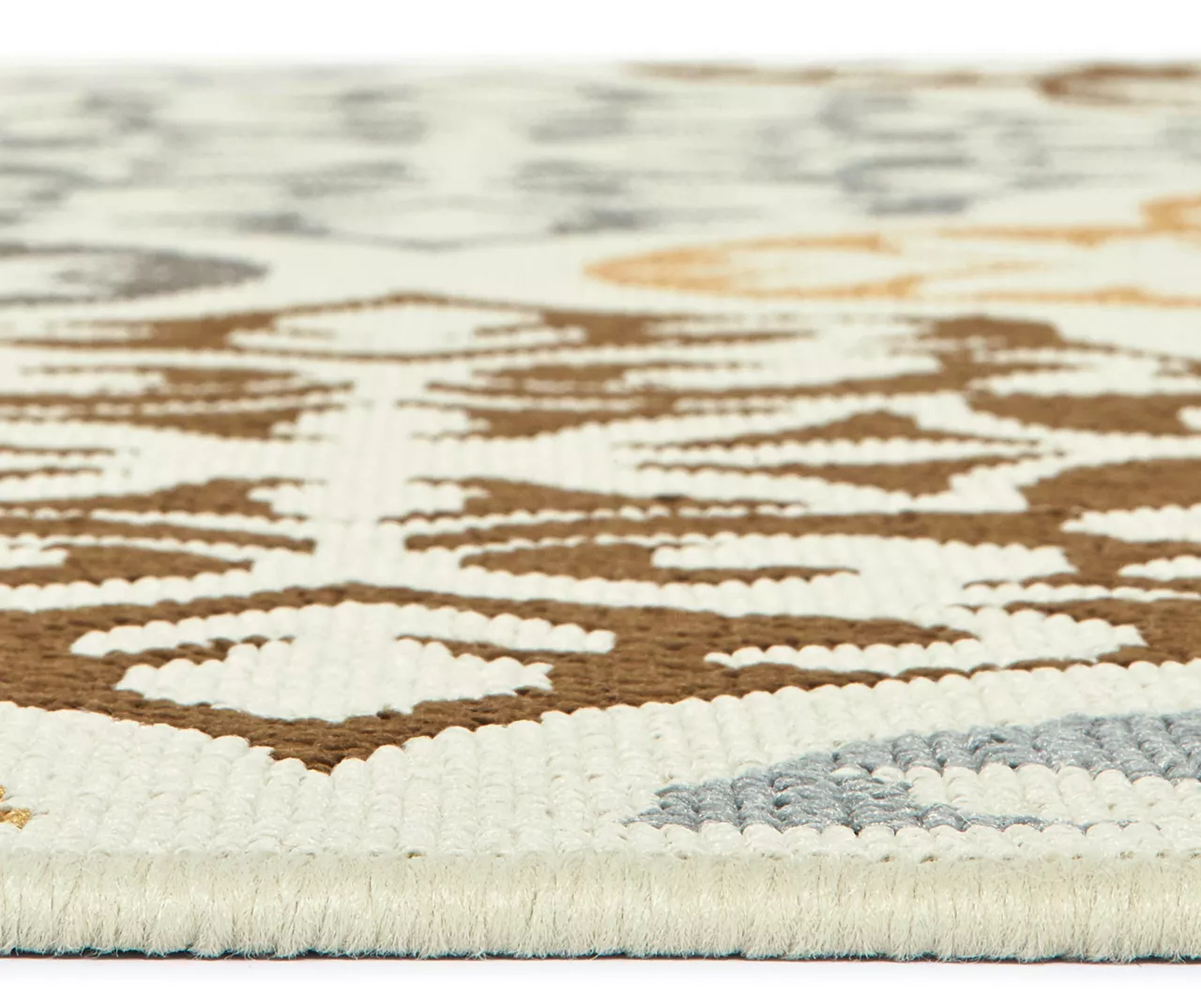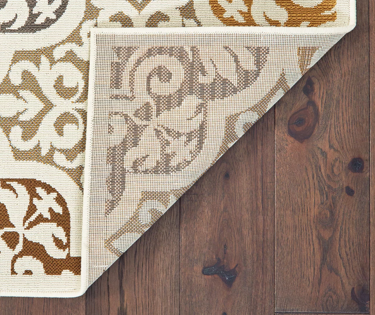 - Colors in this rug include ivory, gray, gold, slate blue and brown