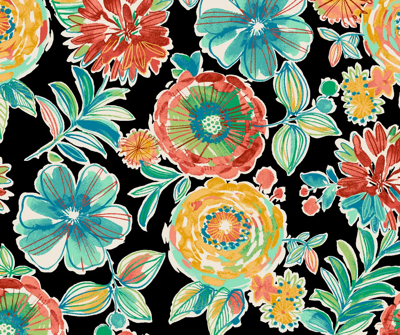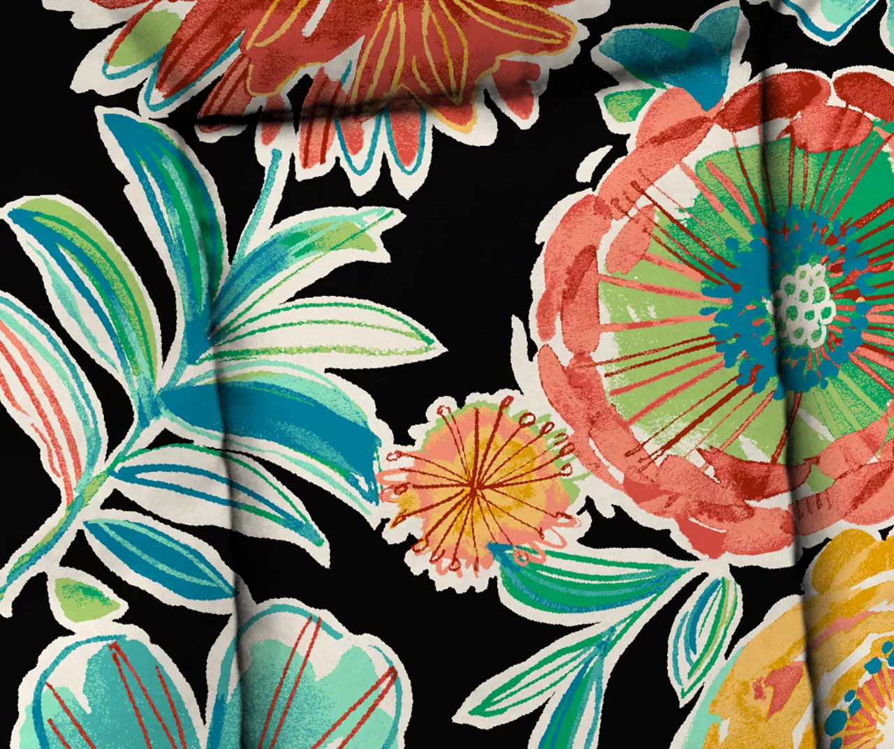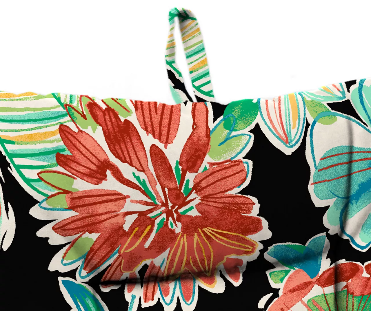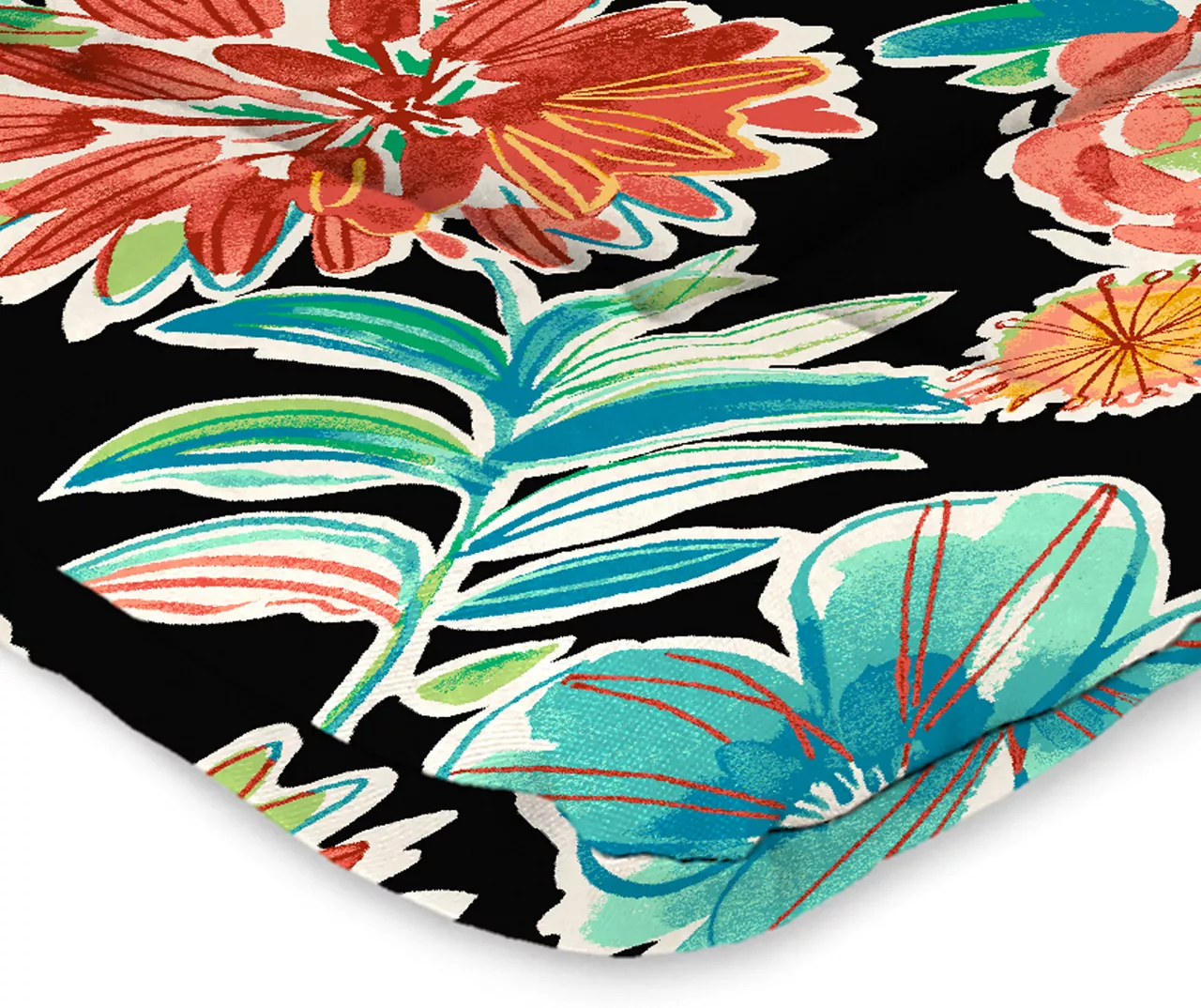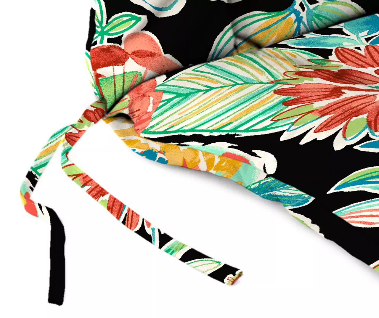 - Deep black Euro-style outdoor chair cushion with a colorful floral pattern