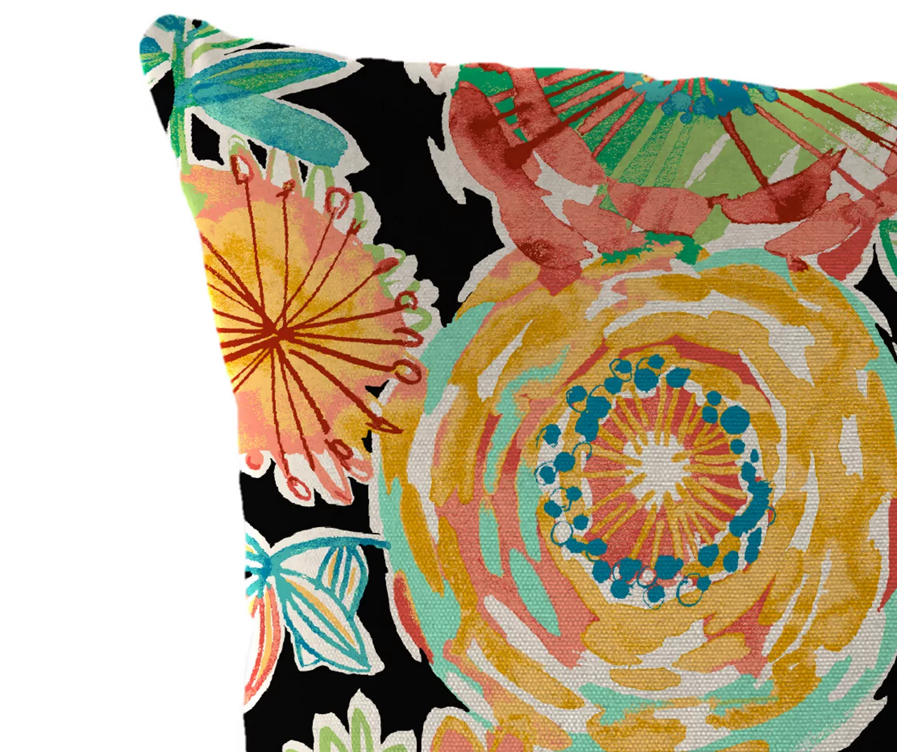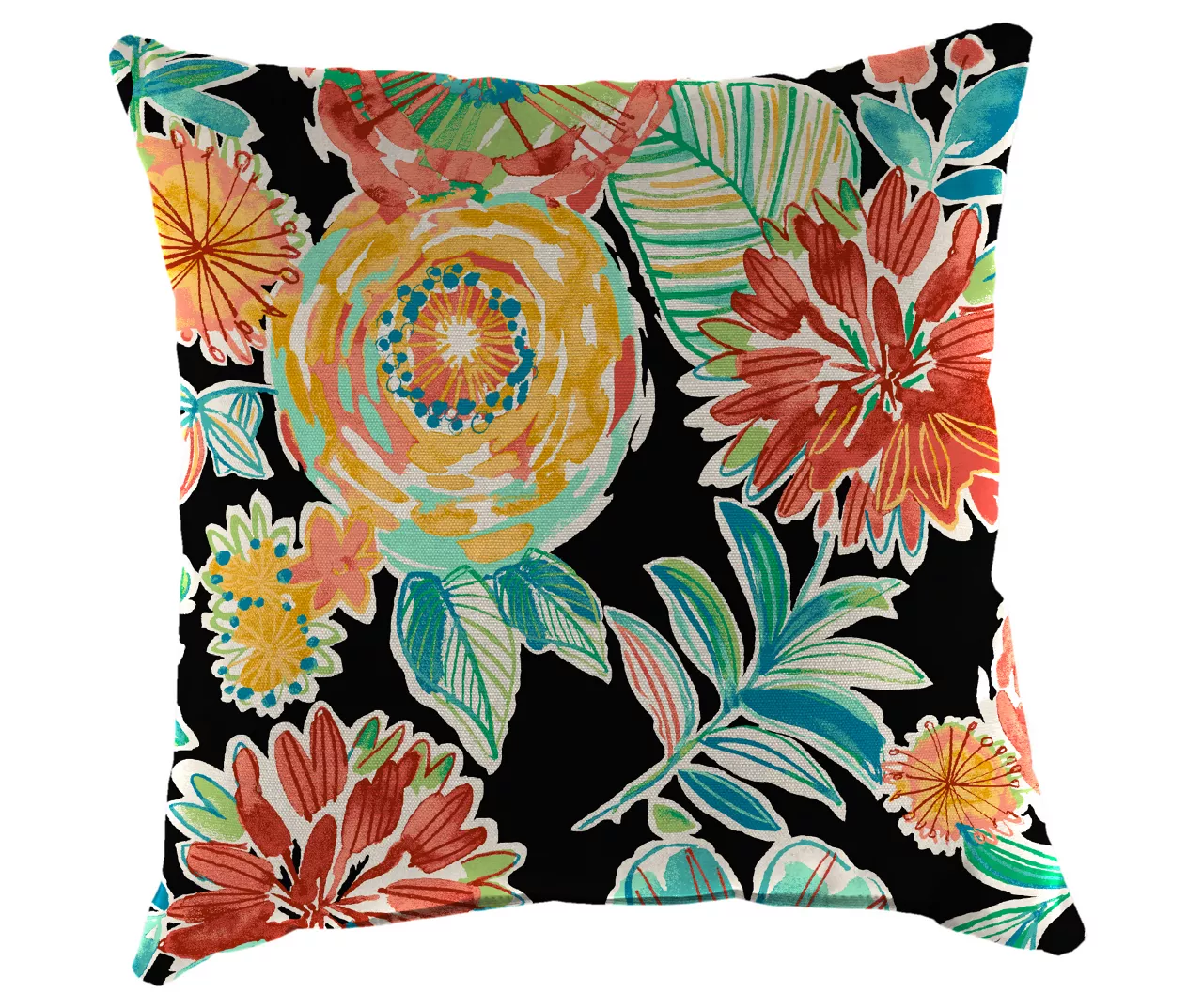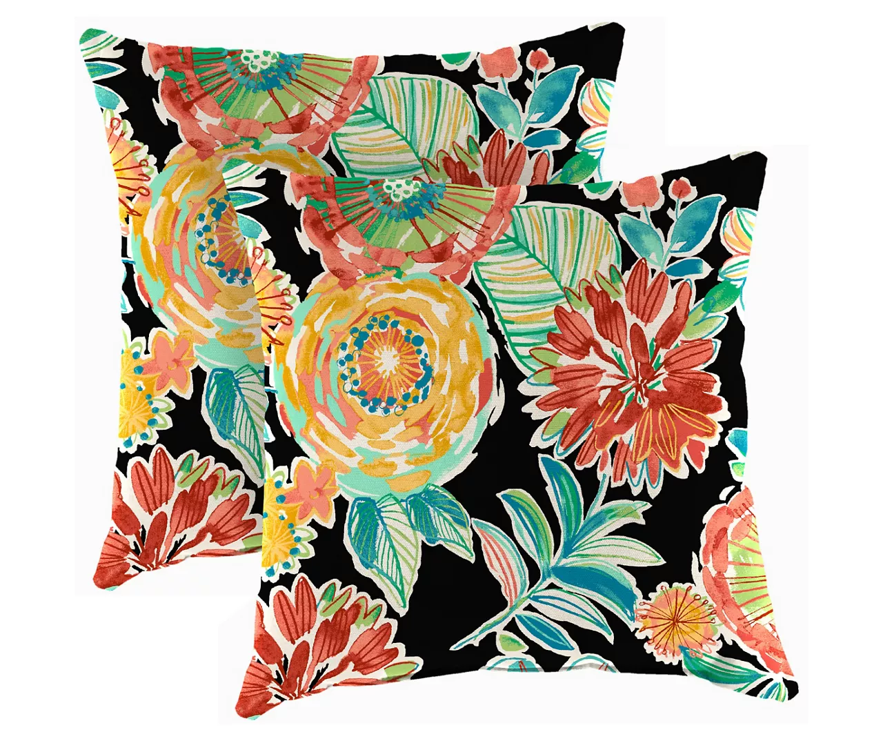 - Deep black outdoor throw pillows with a colorful floral pattern