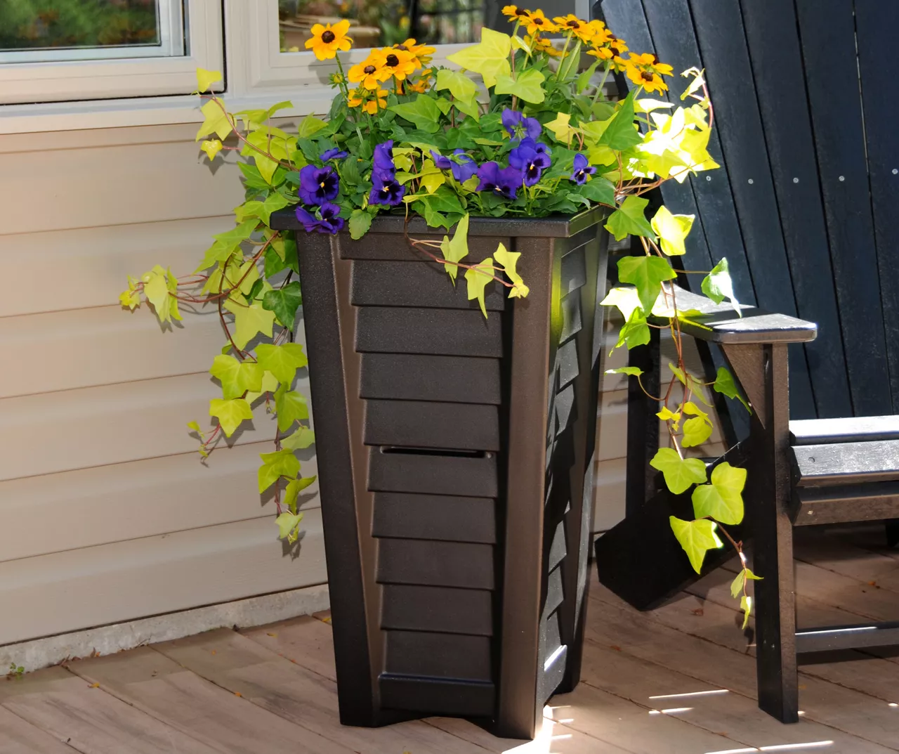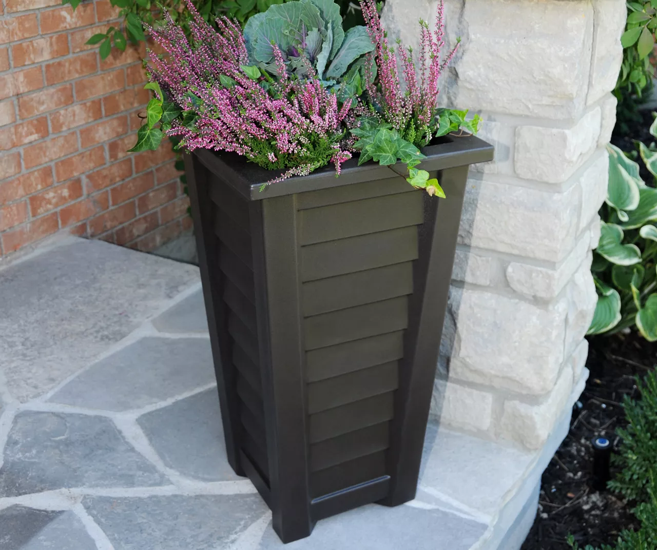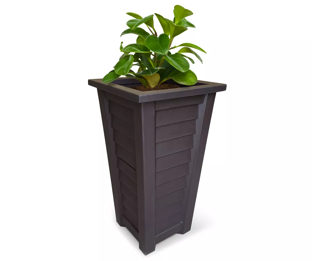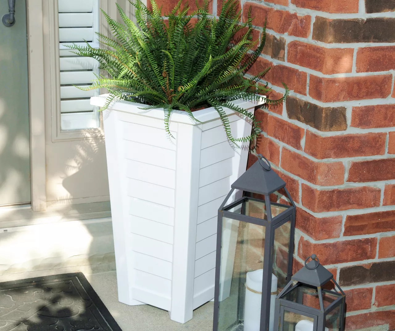 Create the perfect finishing touch to any patio or porch with the simple and stylish Lakeland tall planter in crisp white. This tall planter is made out of molded resin that avoids fading and has a built-in water reservoir system that encourages healthy plant growth by allowing plants to practically water themselves. The Lakeland tall planter has the look of classic wood design without the up-keep.