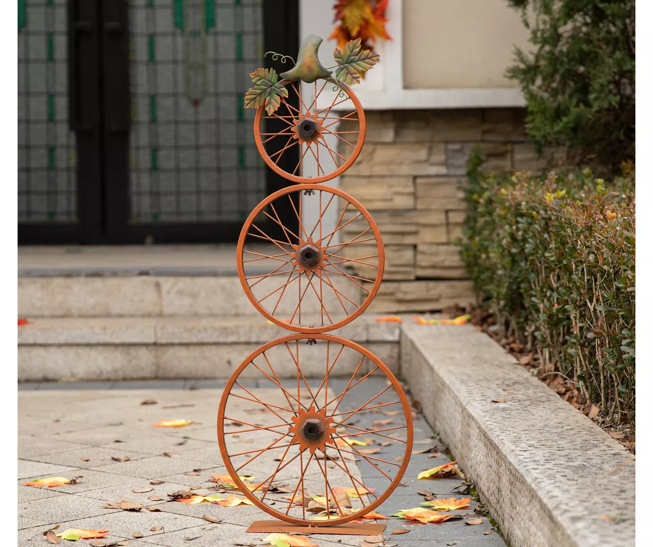 This artistic sign is stacked vertically and is made up of three bicycle wheels and metal base. It’s a creative and eye-catching fall decoration for your home. Display this decoration in indoor or outdoor locations.