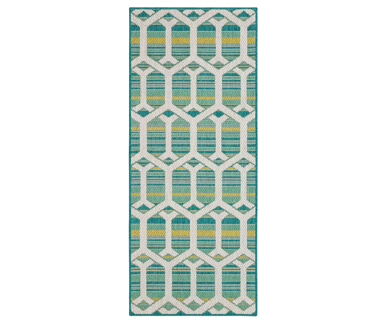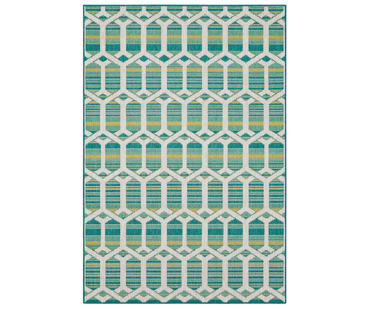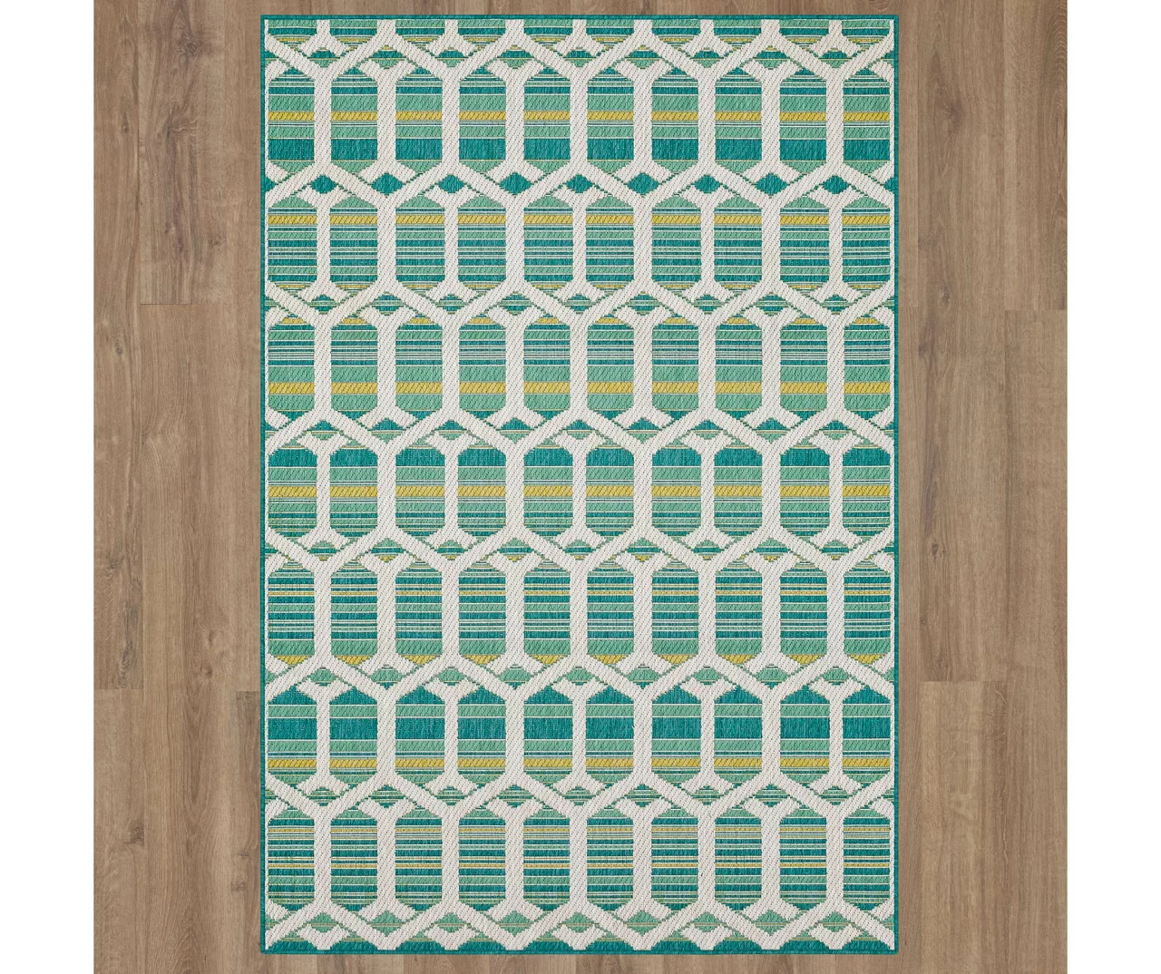 - Geometric and stripe design in a soft teal and green palette for a modern look