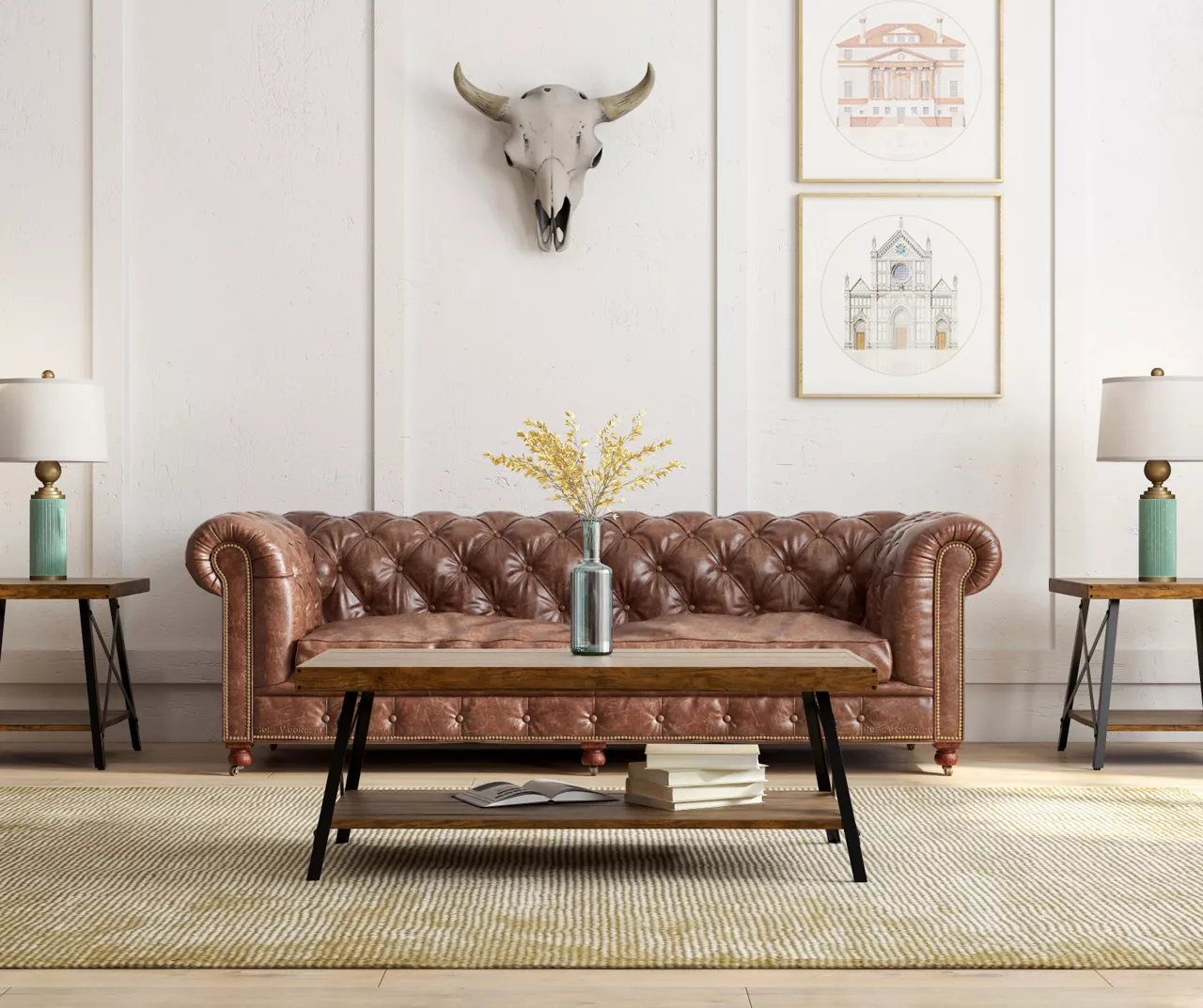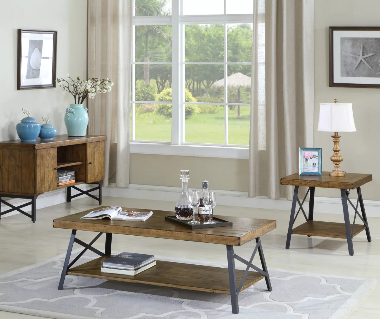 - The Pomona coffee table brings a rustic, industrial touch to your home with distressed wood surfaces and metal accents
