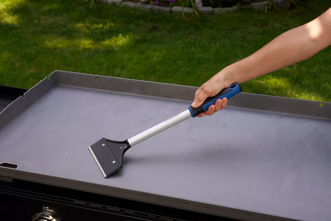 Don’t spend more time cleaning your griddle! The Razor griddle scraper is the key to a clean griddle every time without the hassle and fuss. Made with a stainless steel scraper blade, even burnt and stuck-on food is no match for this scraper. The stay cool handle keeps your hands safely away from the heat with a soft comfortable grip. Includes a hole in the handle for simple hanging and storage when not in use.