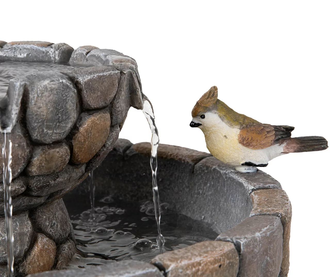 - Features 2-tier design with smooth pebble look and bird figures