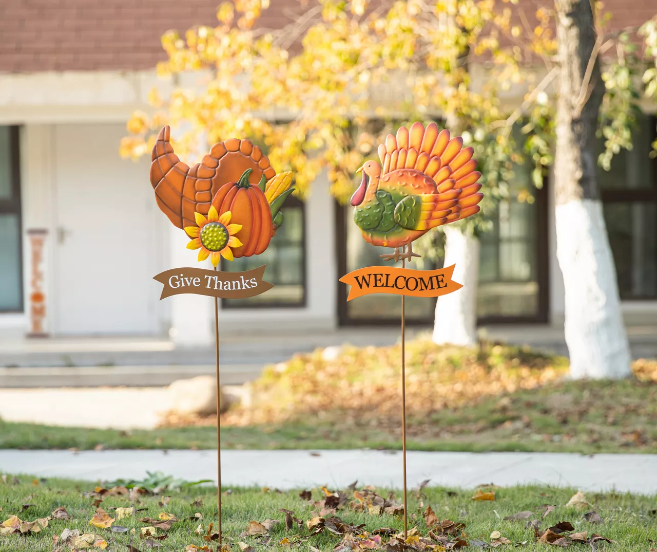 - “Give Thanks” message with cornucopia top featuring a sunflower, pumpkin and corn