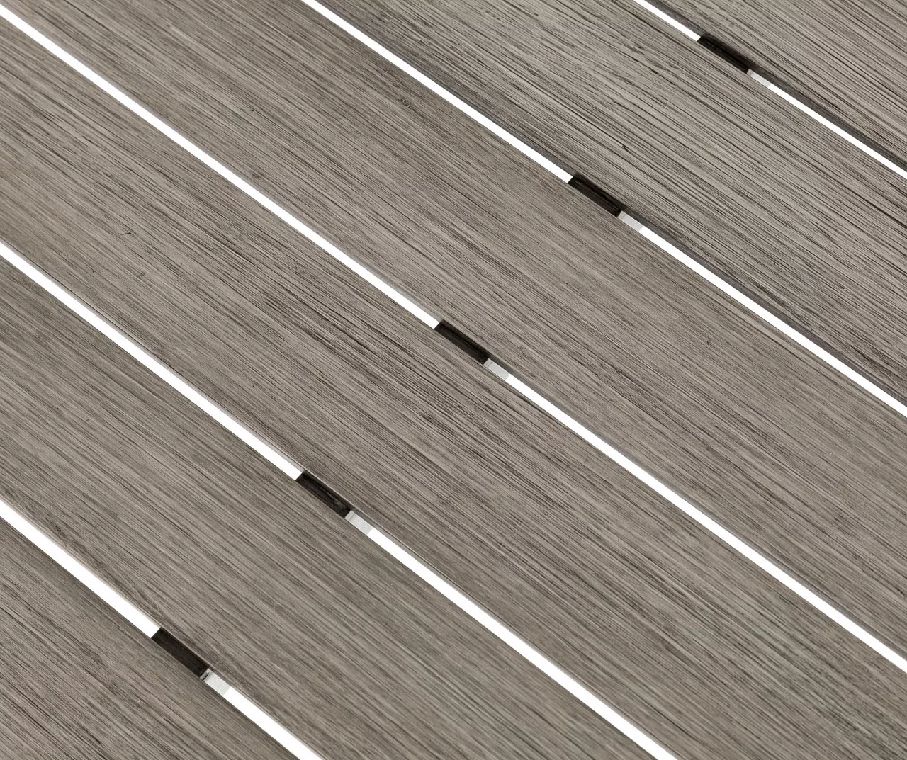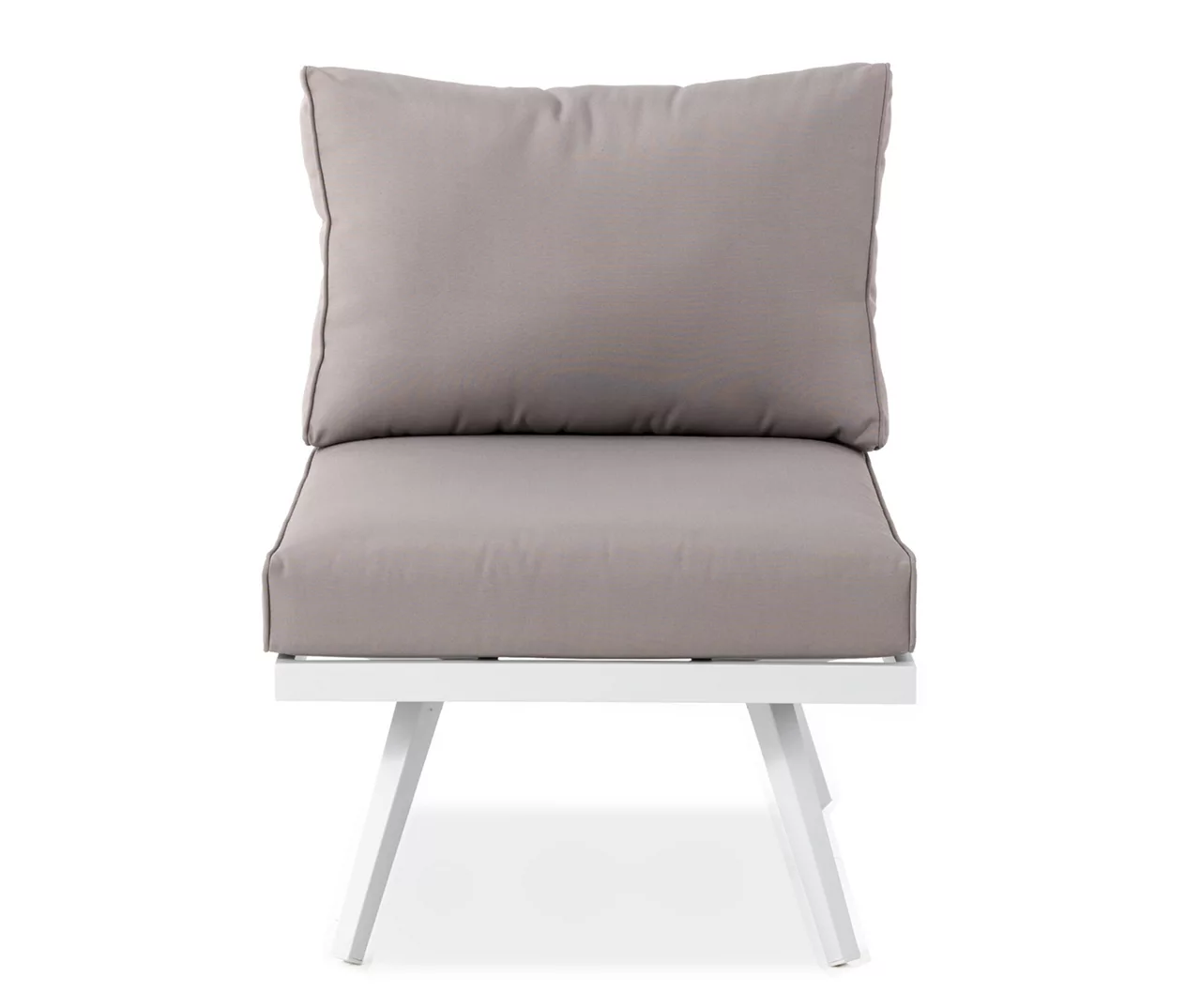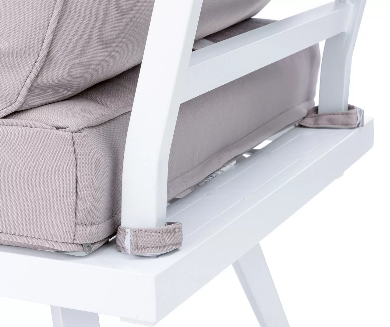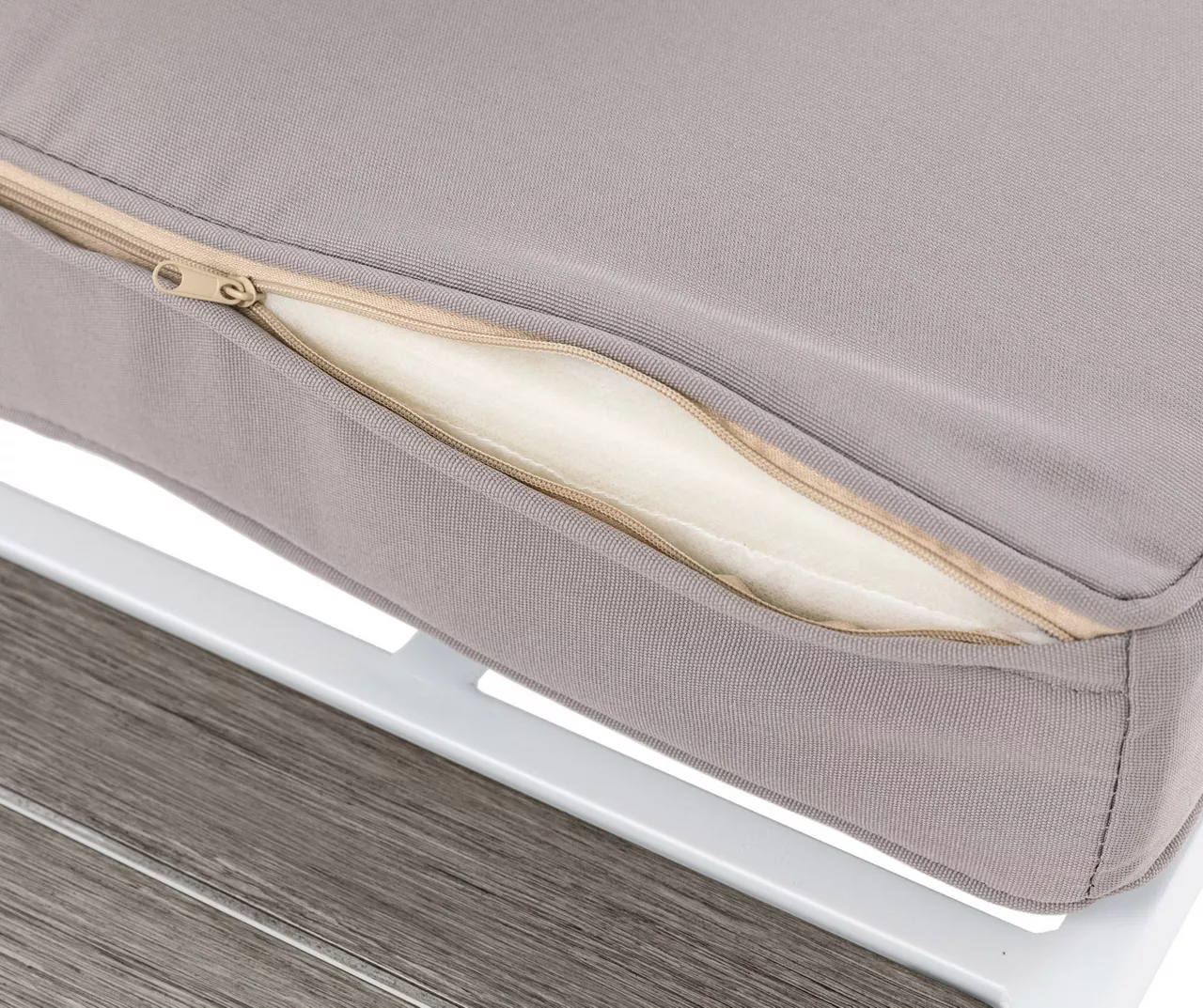 - Light gray weather-resistant olefin cushions with polyfoam construction