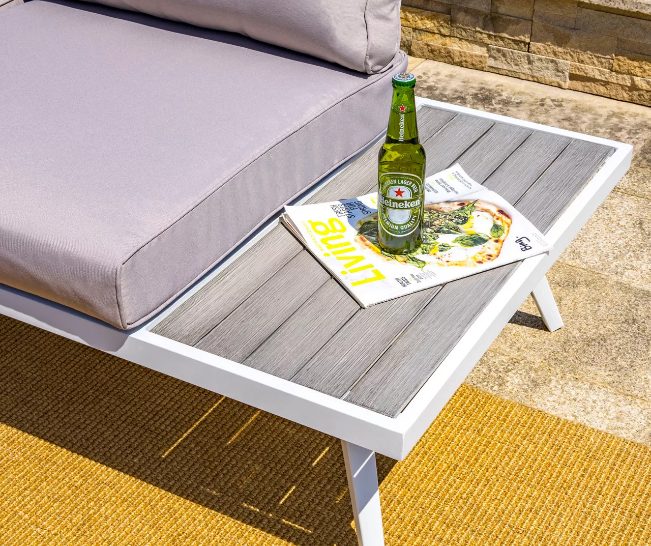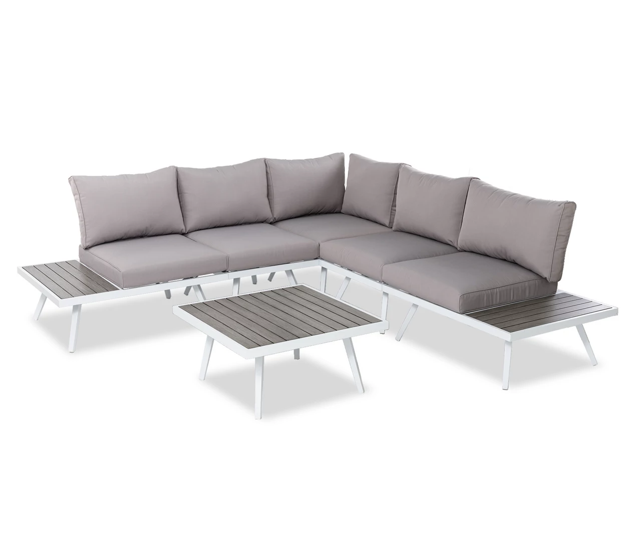 Update your outdoor living space in stylish, contemporary design with this Glitzhome sectional seating set. White powder-coated aluminum frames are accented by hand brushed tabletops as light gray olefin cushions offer relaxation. Complete with a coffee table for setting items on, this modernized arrangement is perfect for a patio or deck.